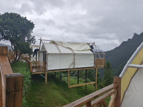 福建省武夷山旅行社深入政和县天村稠岭露营地,对帐篷及大型家具物品进行加固和检查,拆除露营地帐篷外帐,转移帐篷物资,检查排水管道,设置警戒线,做好台风防御工作。