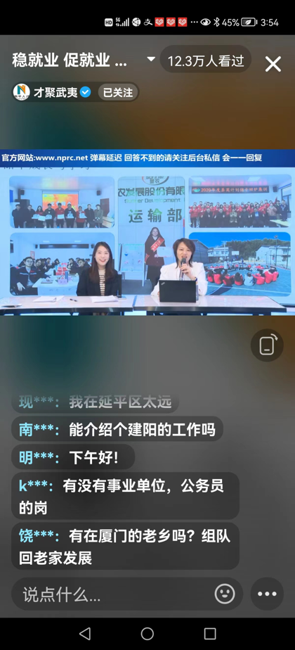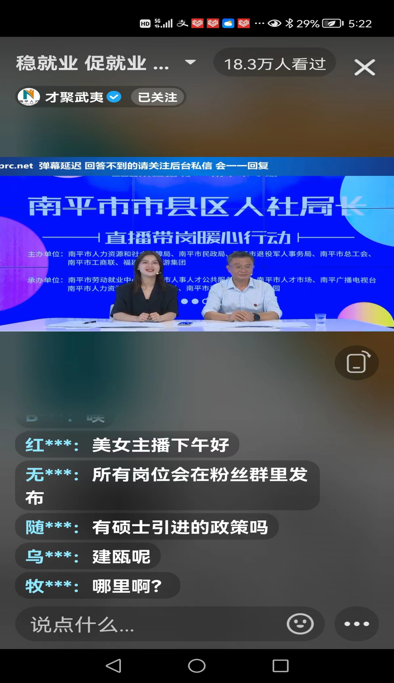 “才聚武夷”抖音直播间助力南平市人社局开展“金秋招聘月”活动,并联合抖音官方创新举办“dou来云招聘——局长携企送岗直播招聘会”系列活动。截止目前,南平市人社局、浦城县人社局、松溪县人社局分别携圣农集团、太阳电缆、华谊三爱富科技等23家优秀企业,为线上网友提供地方经济建设前景展示、南平人才政策、企业实力、企业发展规划、岗位薪酬、岗位福利、人才培养等咨询服务。累计吸引求职人员和潜在求职人员观众28.8万人次,“才聚武夷”求职粉丝净增657人,南平人才网收集求职简历423份,为参会企业储备一批优秀人才资源的同时,进一步扩大品牌宣传。