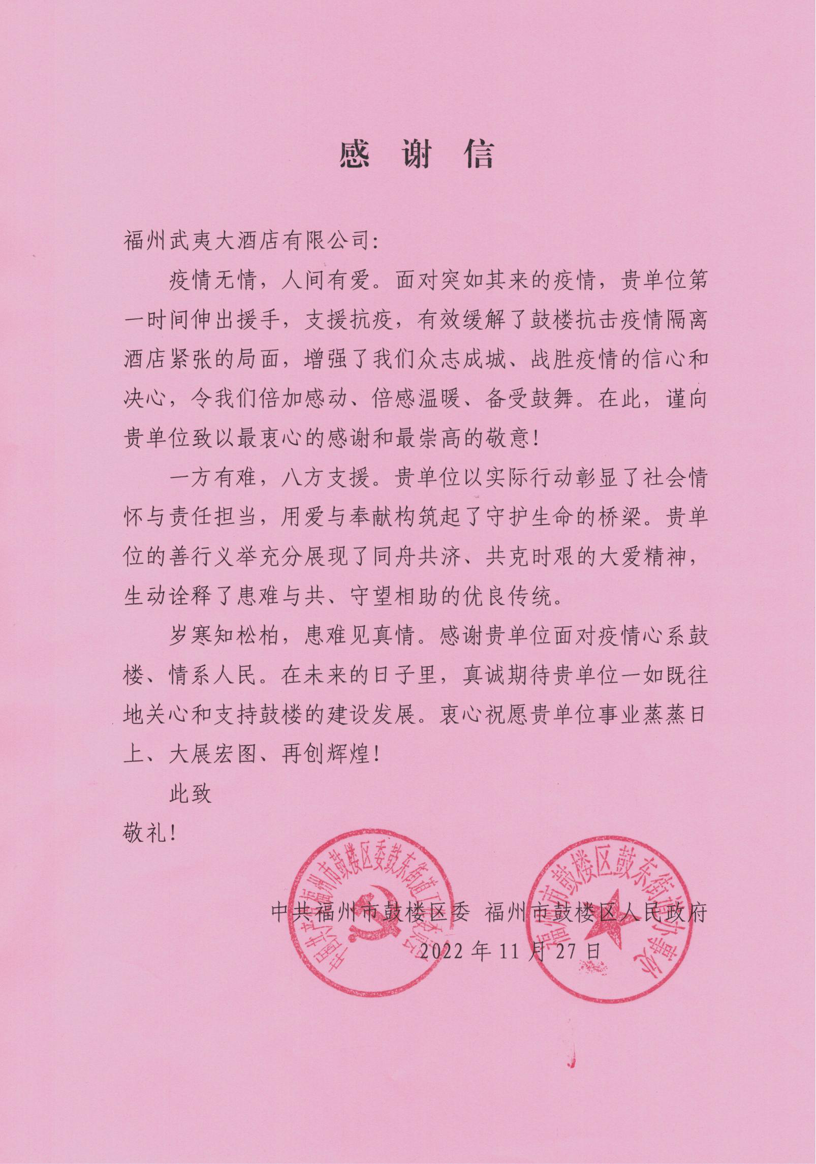 酒店主动承担起国有企业的社会责任,积极部署行动,充分发挥党总支战斗堡垒作用,动员酒店全体党员干部、职工认真配合辖区政府开展集中隔离观察点的疫情防控和服务保障工作,并安排两批次共14名工作人员入驻隔离观察点核心区开展场所消杀、物资配送等工作;同时做好隔离点工作人员思想工作,帮助他们克服恐惧、疏导情绪、增强信心,战胜高压工作对生理和心理的双重考验,保证隔离观察点工作有序运转。截止目前,酒店共顺利接收转运集中隔离观察人员610余人次,隔离期间实现隔离人员零交叉,隔离点内零感染,工作人员零损伤。酒店集中隔离医学观察点工作受到鼓楼区委区政府的好评并收到感谢信。