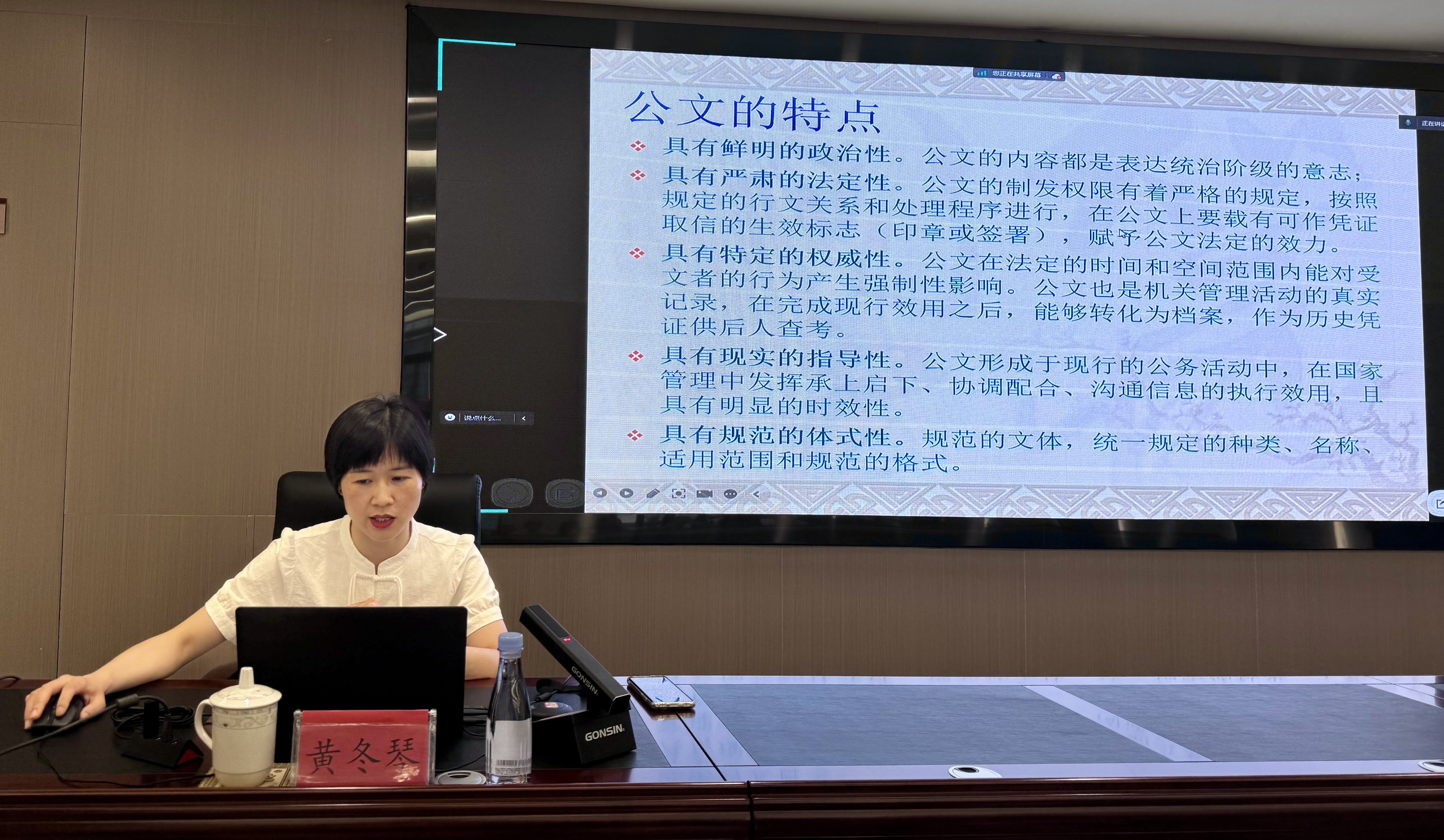 ▲市政府办公室文电科科长黄冬琴讲授《公文处理解析》 授课结束后,现场组织了公文信息写作能力测试,检验学员的学习掌握程度。